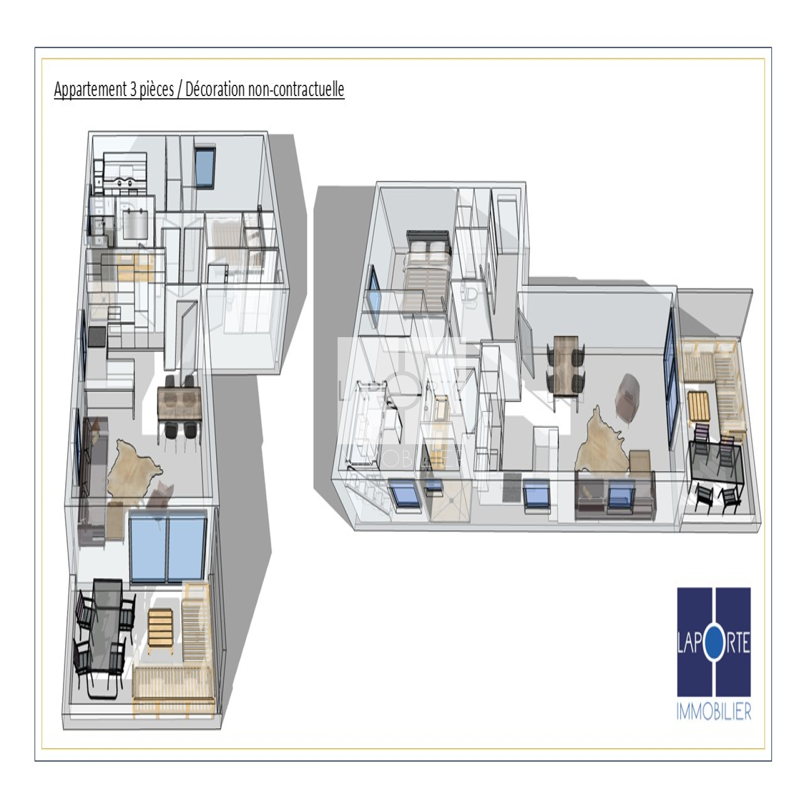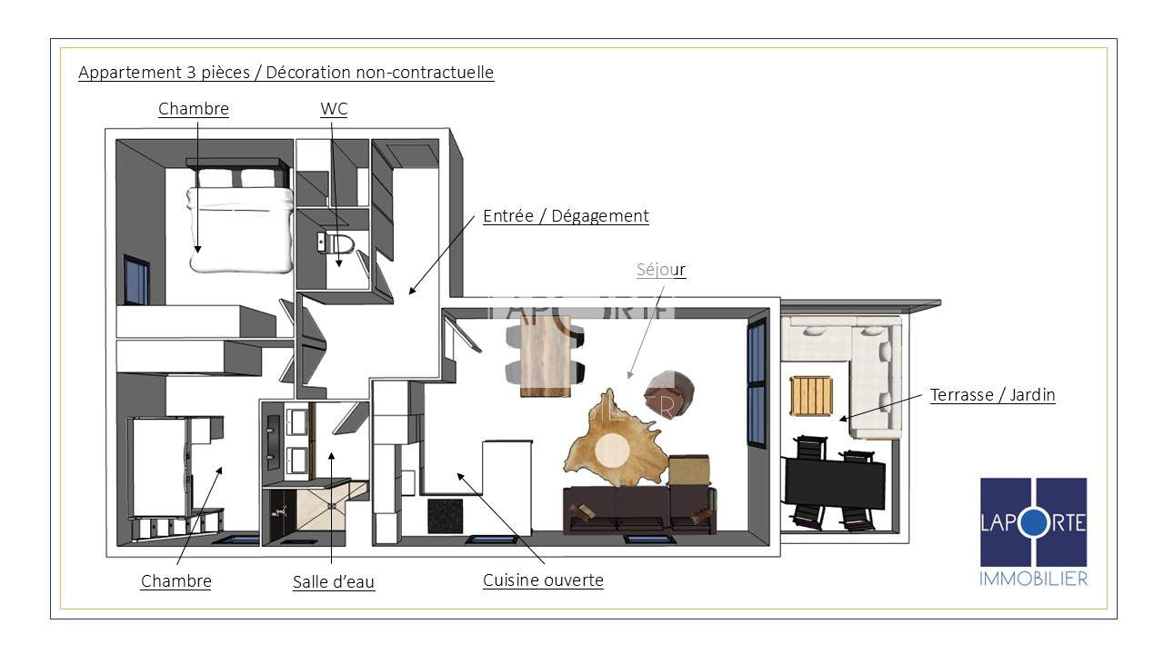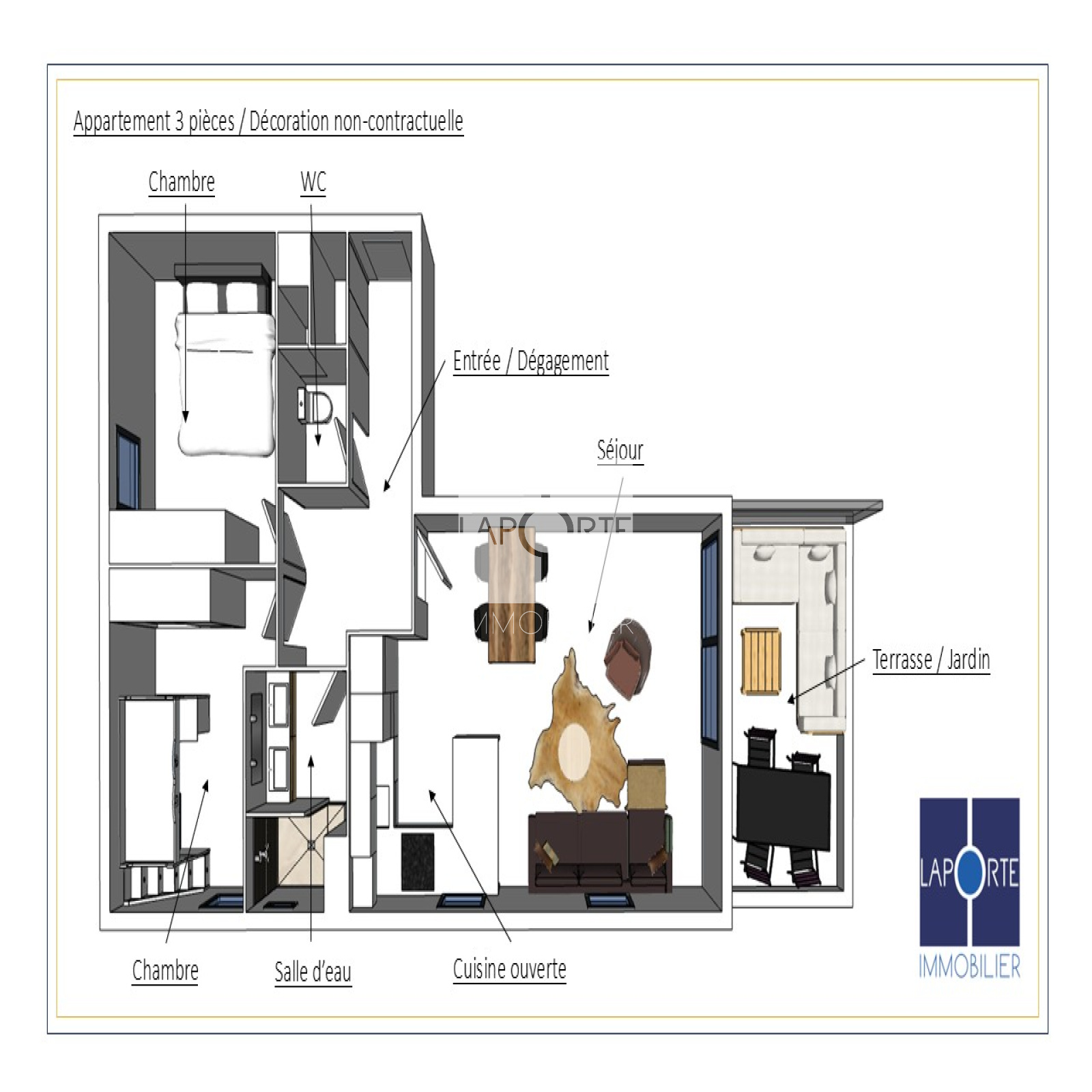 Son architecture lui confère des volumes généreux et de vastes espaces de vie, il se compose d'un salon / séjour avec accès à une terrasse et un jardin, d'une cuisine ouverte équipée, deux chambres avec dressing intégrés, d'une salle d'eau, d'un WC indépendant avec coin buanderie et d'une entrée avec placard de rangement.