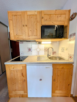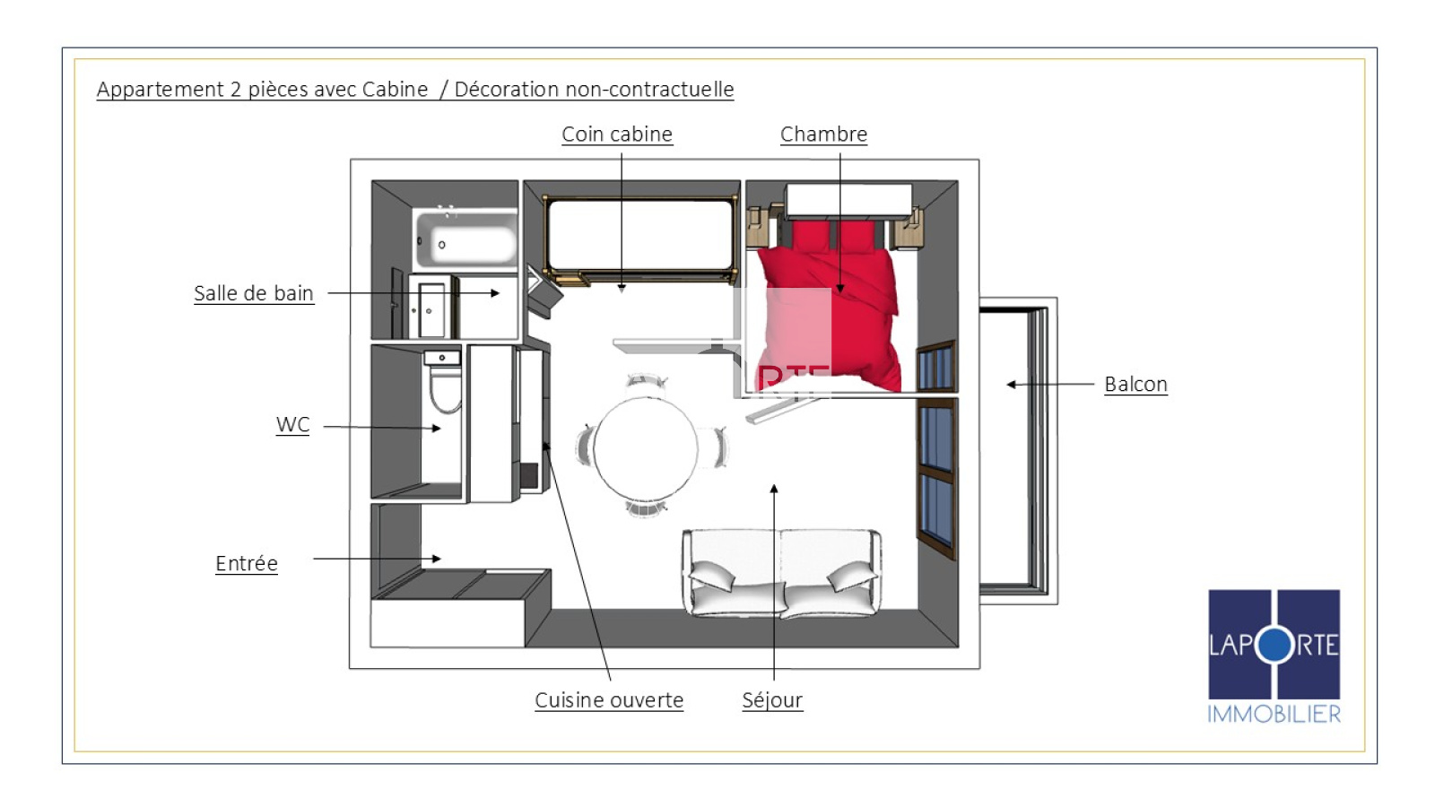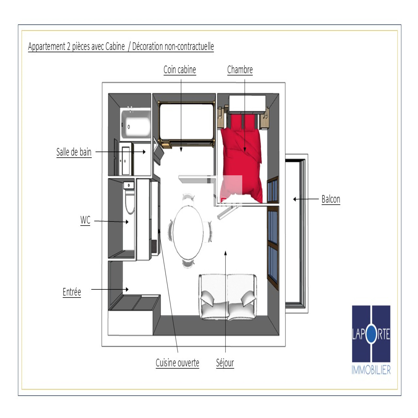 L'appartement se compose d'un salon / séjour avec cuisine ouverte équipée et un accès à un balcon, d'une chambre, d'un coin cabine, d'une salle de bain et d'un wc.