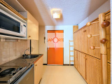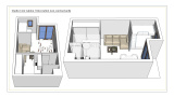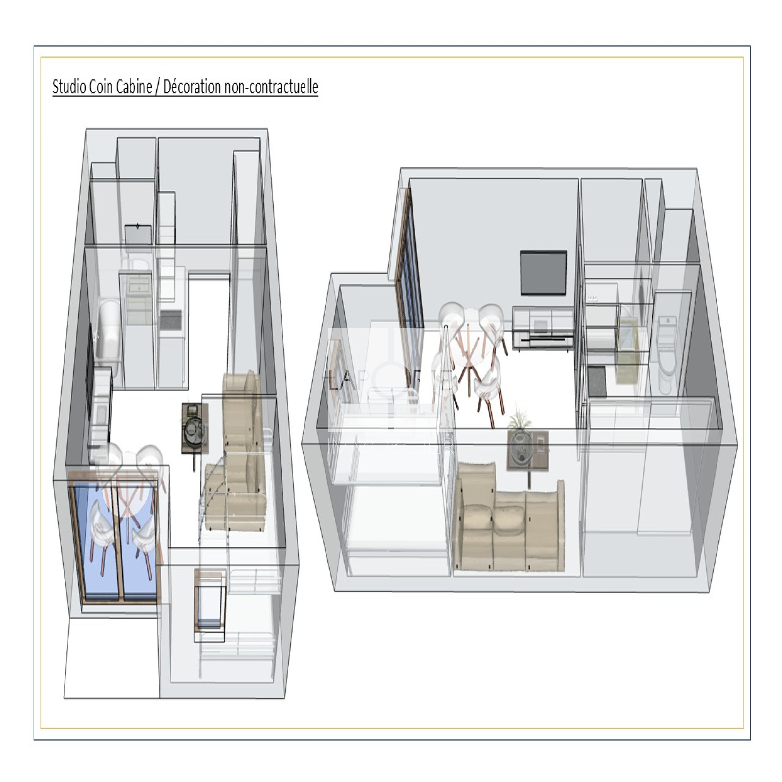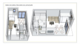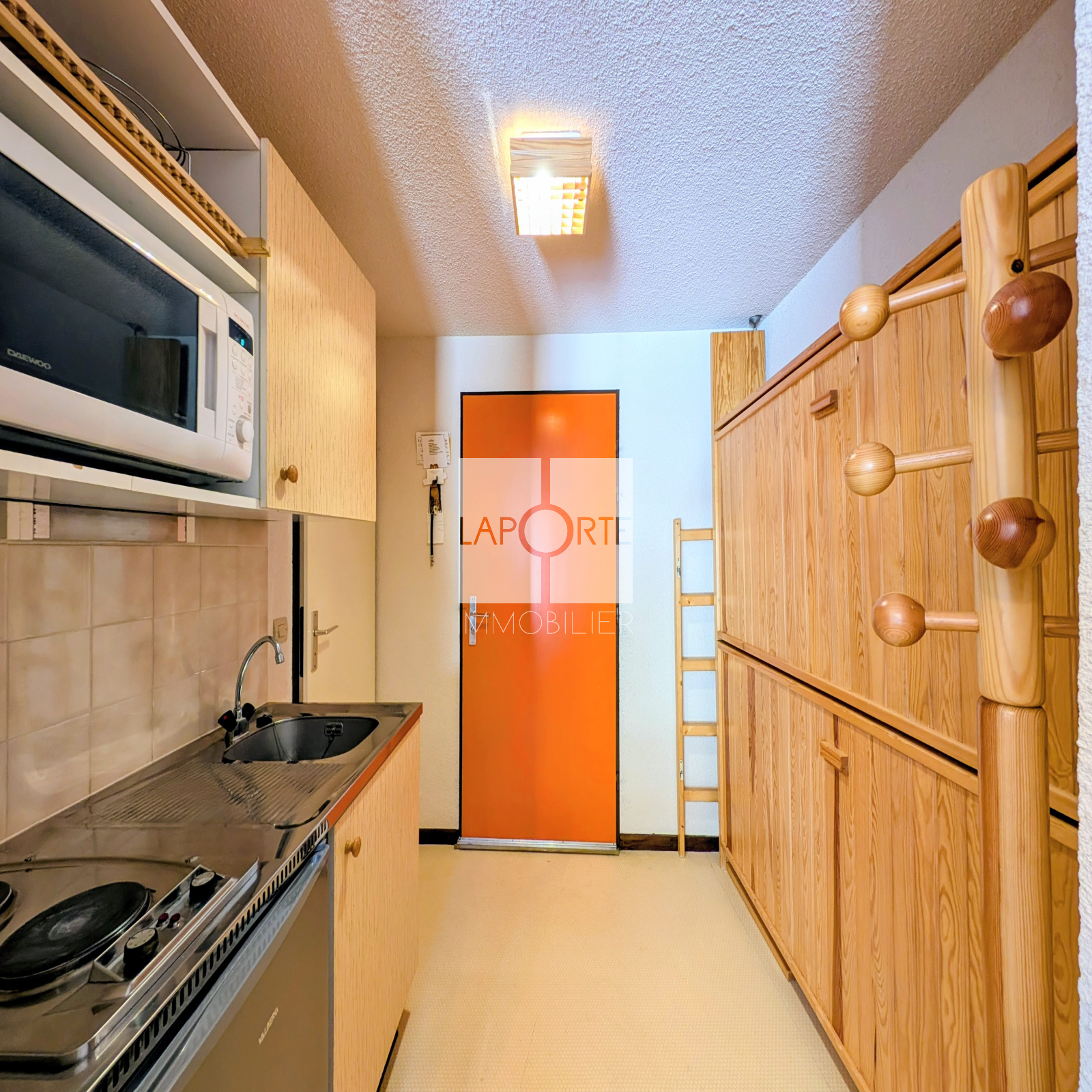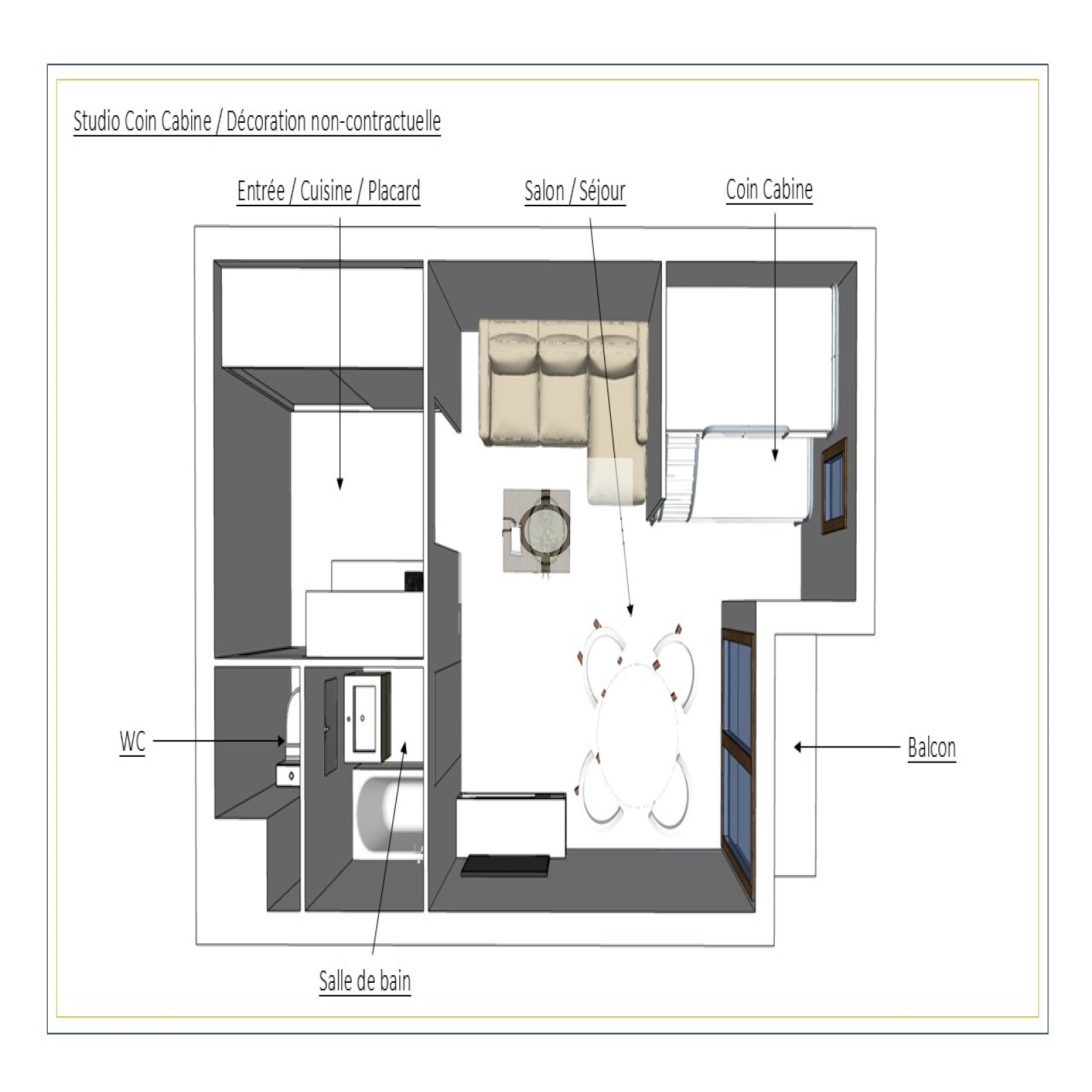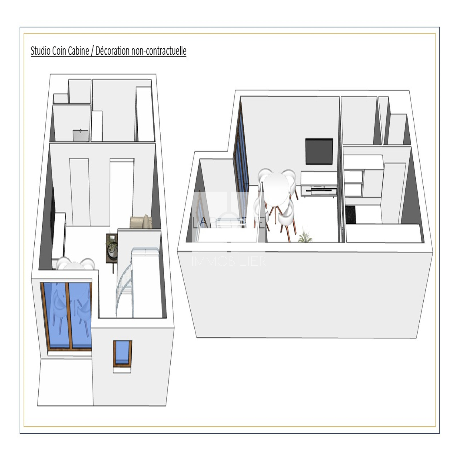 Le studio se compose d'un salon / séjour avec coin cabine et un accès à un balcon, d'une entrée avec kitchenette et un second coin cabine, d'une salle de bain et d'un wc séparé.