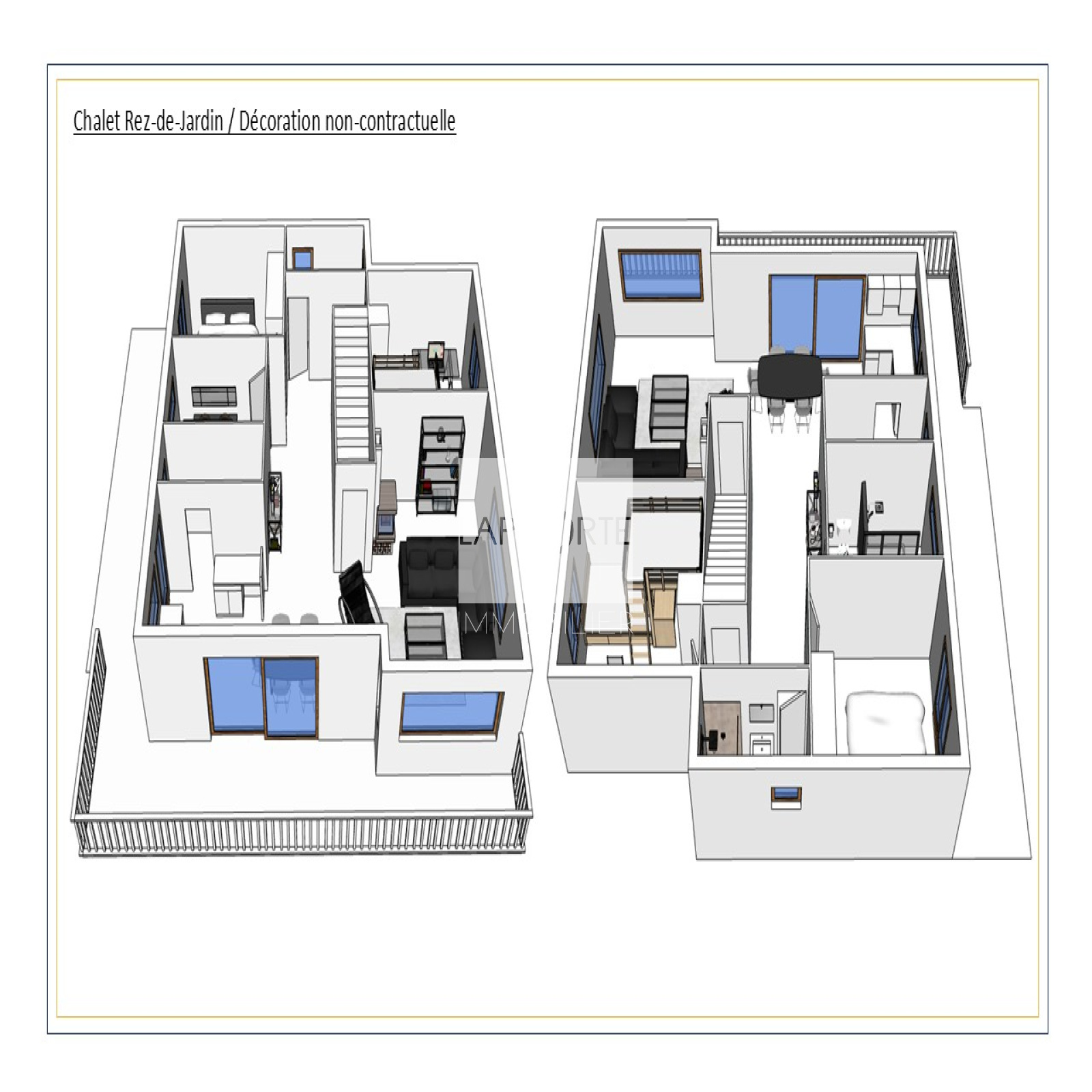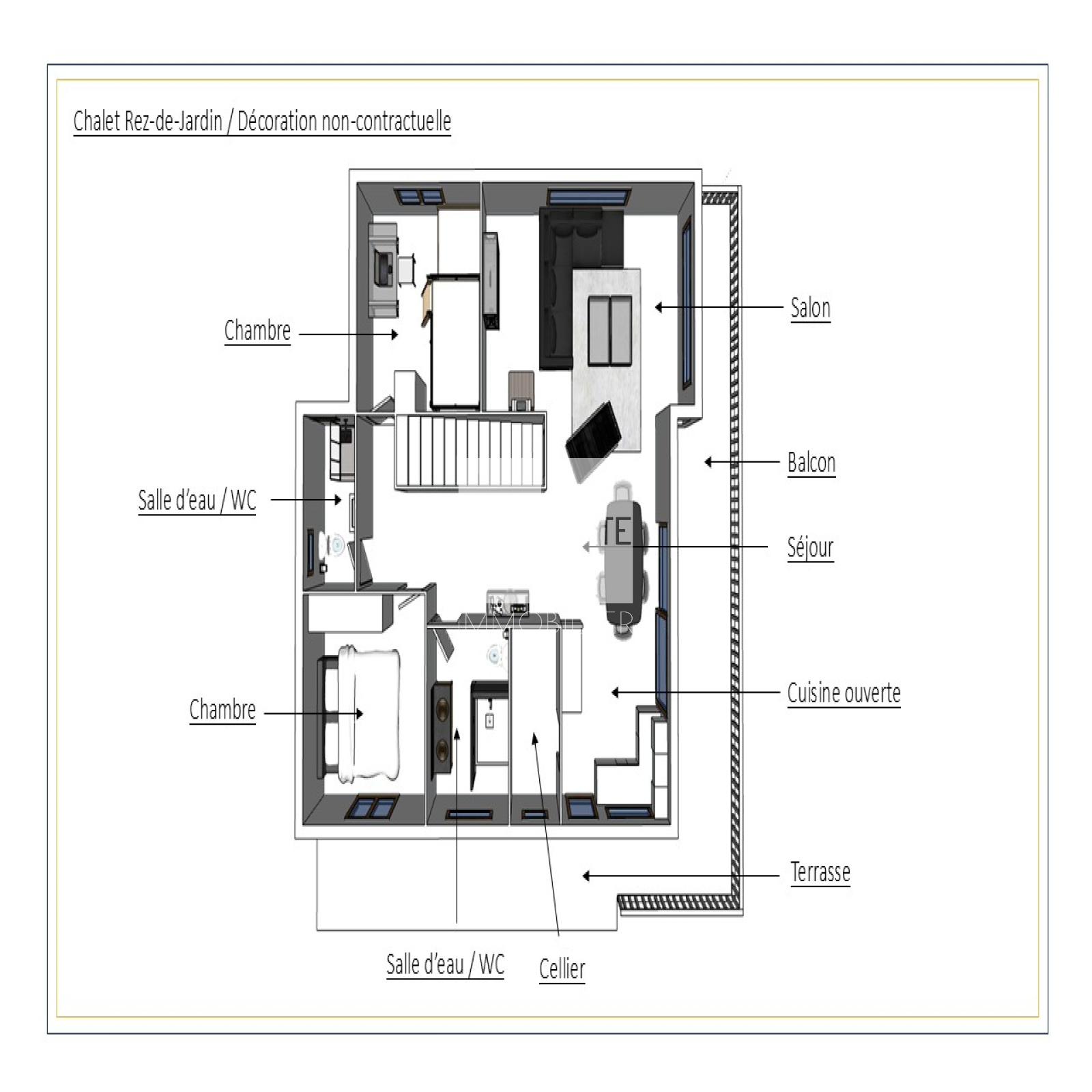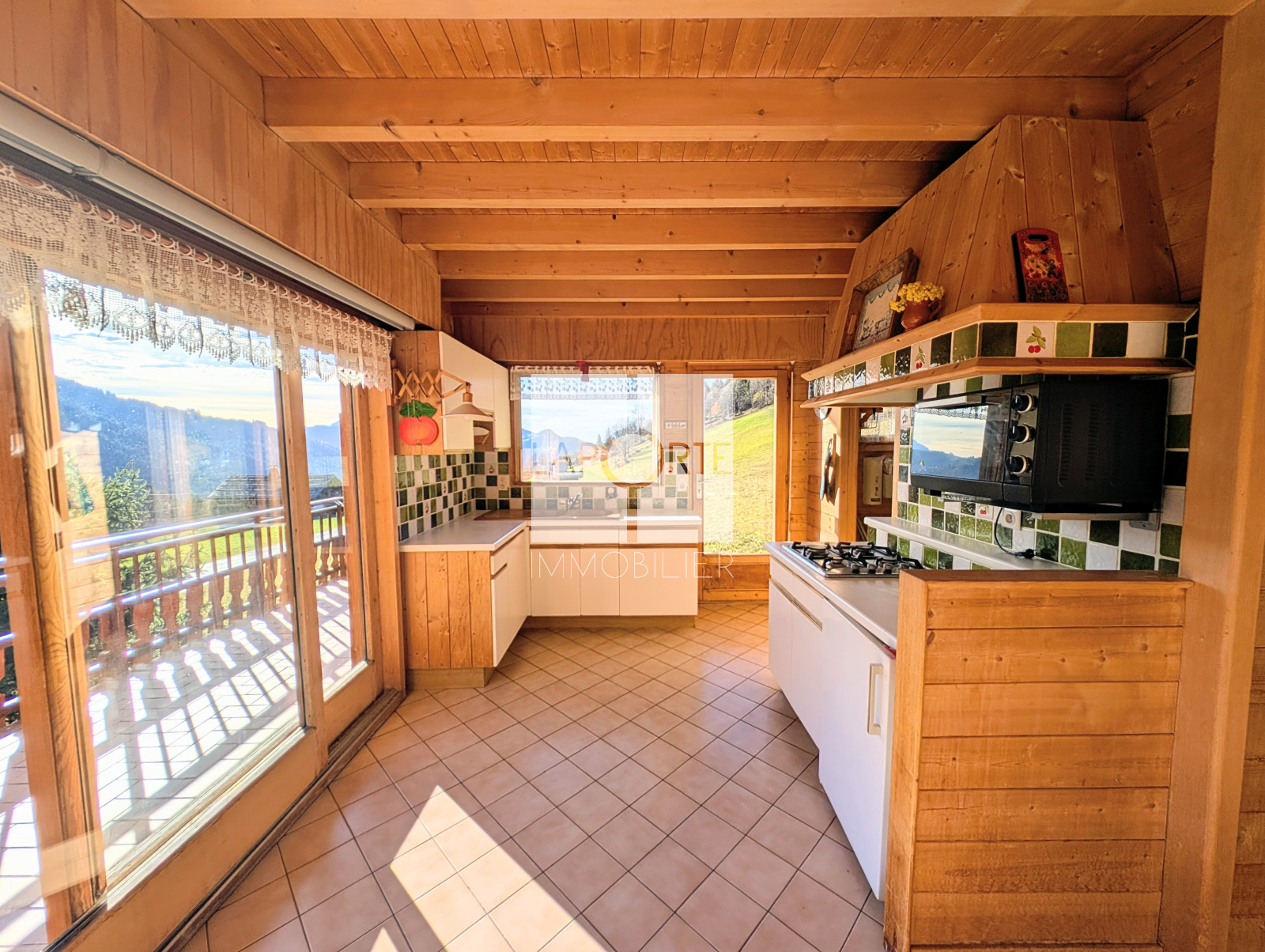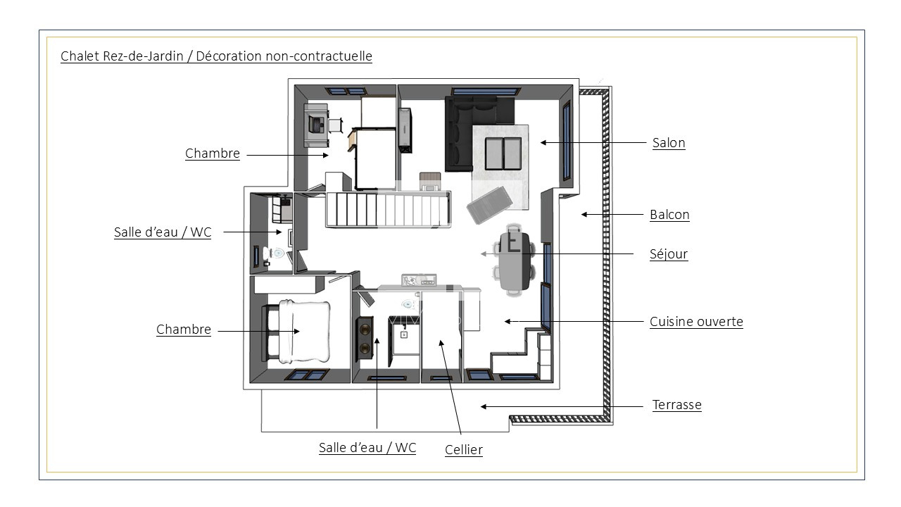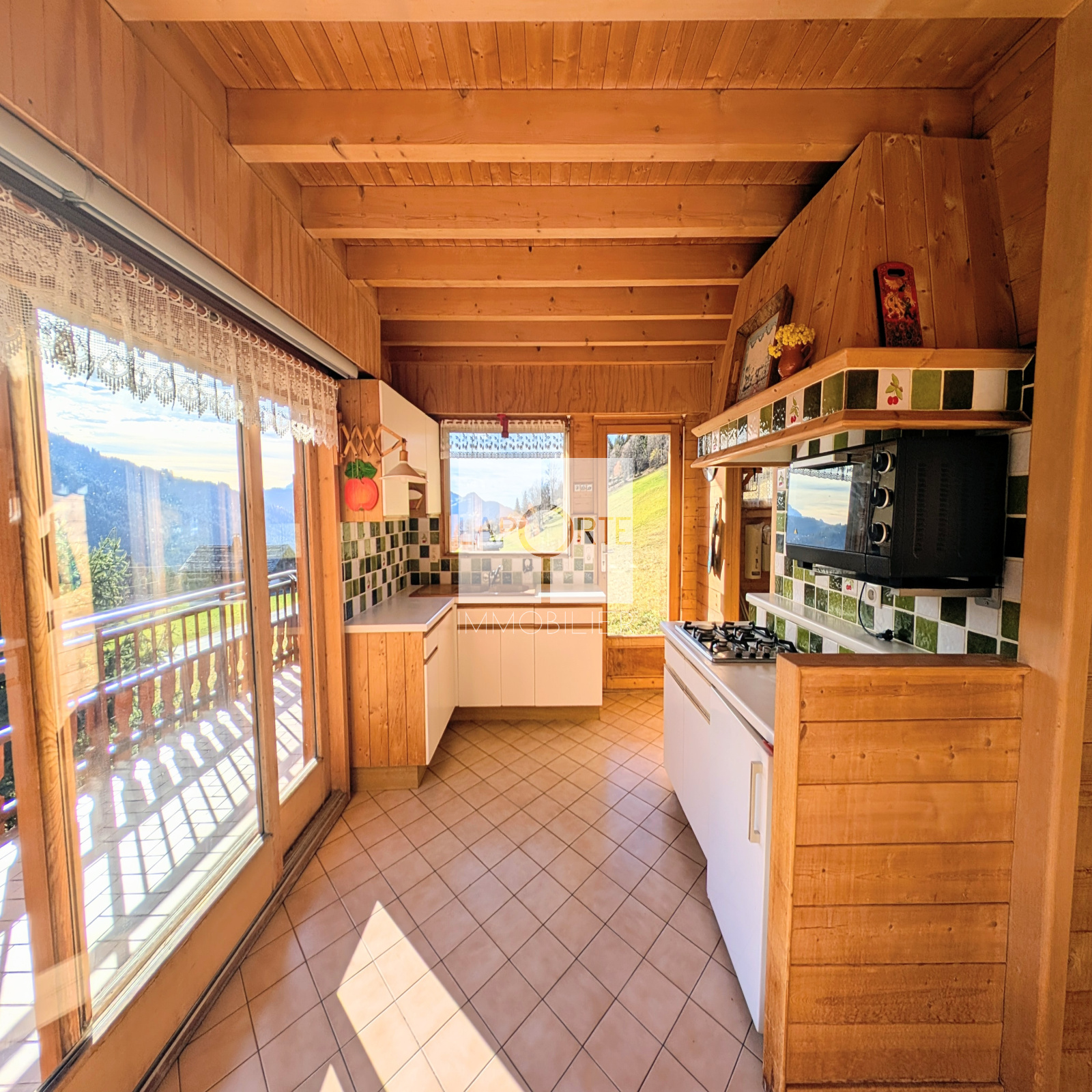 Orienté plein Sud, il bénéficie d'une luminosité remarquable et d'une vue imprenable sur le plateau de Beauregard, la chaîne des Aravis, le domaine skiable et les montagnes environnantes.