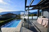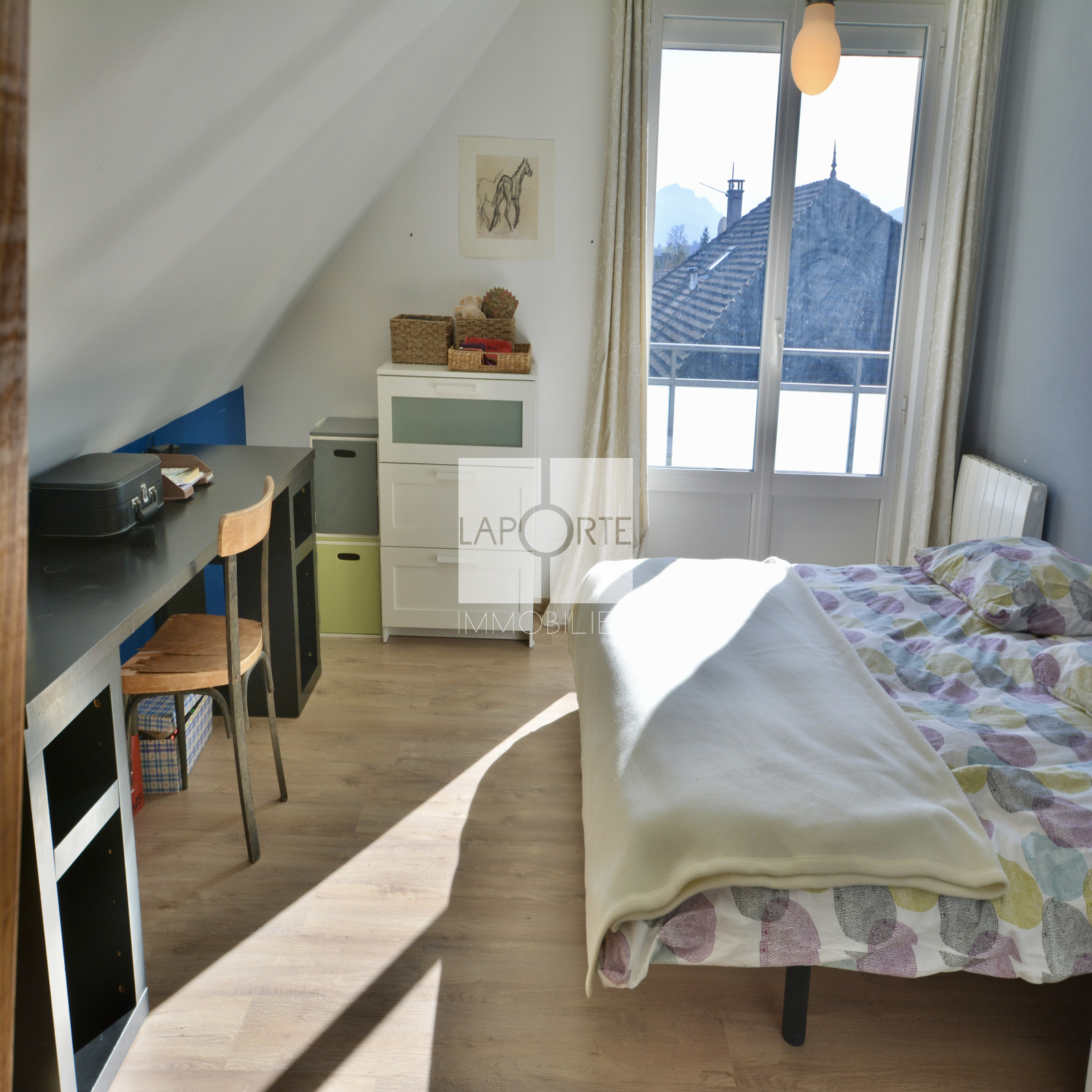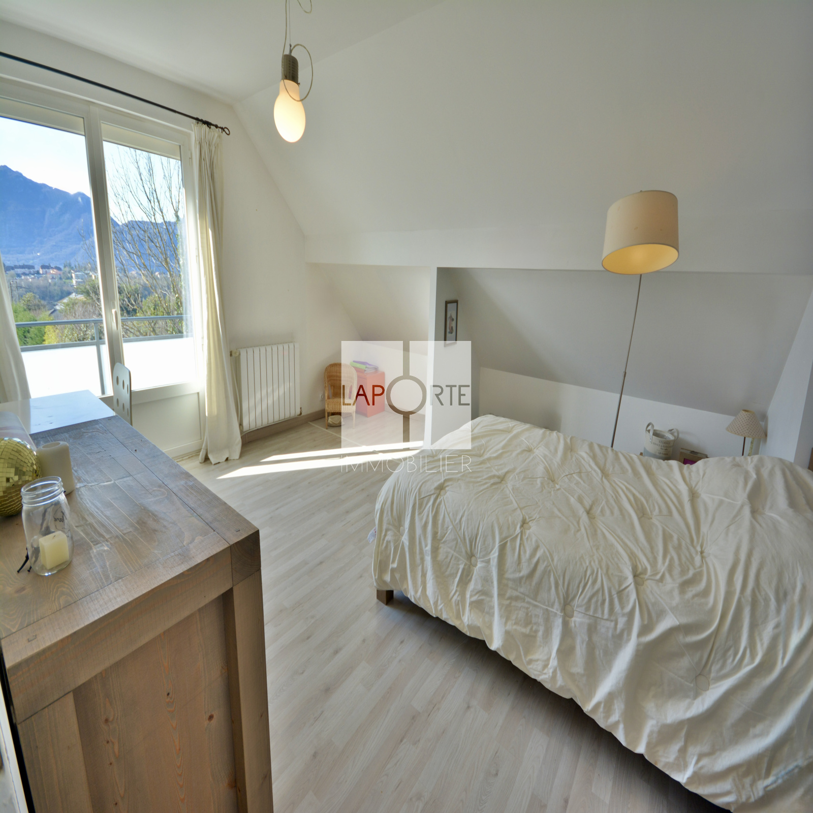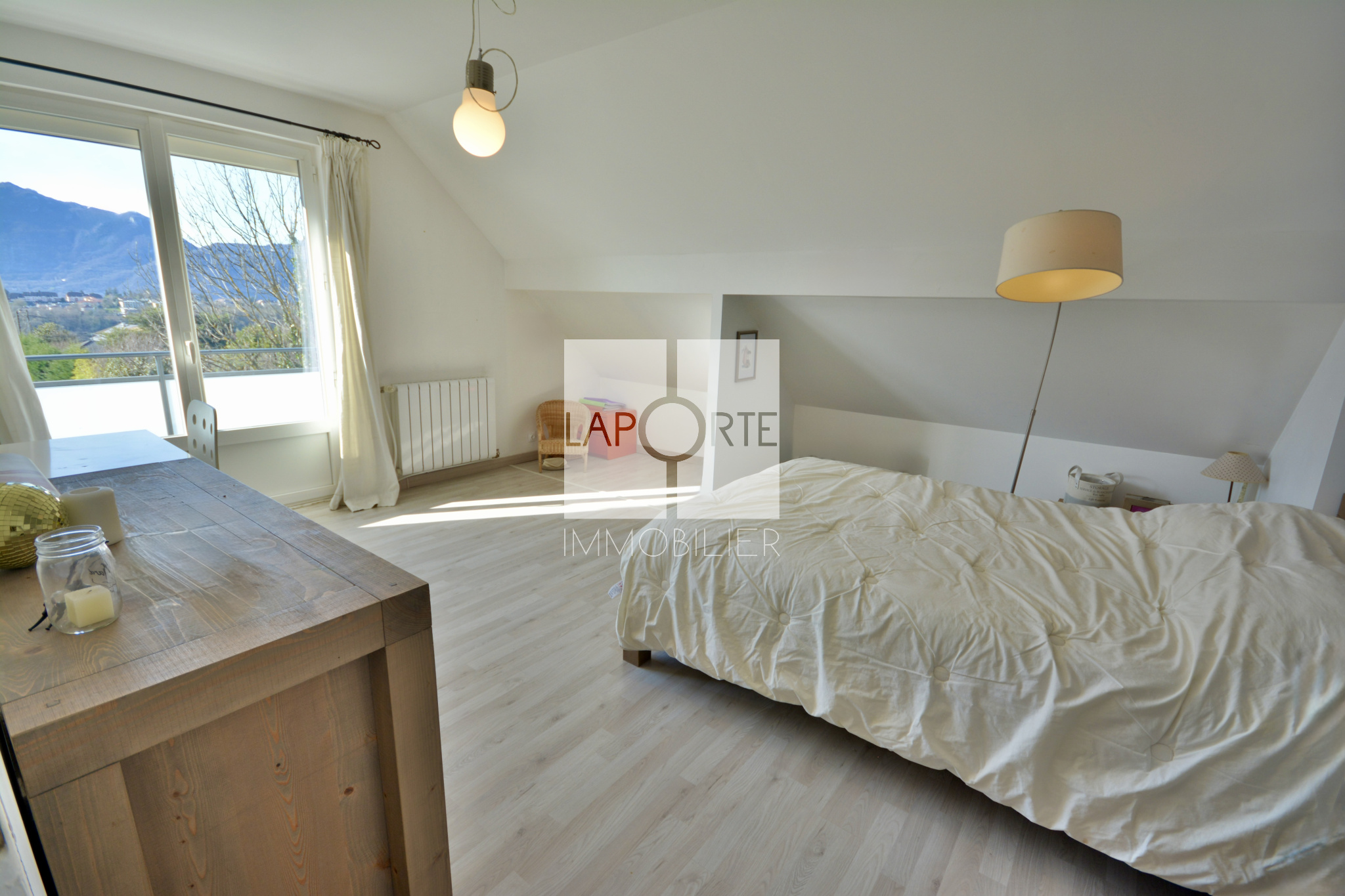 À l’étage, un vaste pallier faisant office de salle de jeux, une salle d’eau, 5 chambres de 10m² à 15,5m² dont 4 avec balcon exposé sud et ouest offrant une vue dégagée sur la croix du Nivolet, la Dent du Chat ou les Belledonnes.