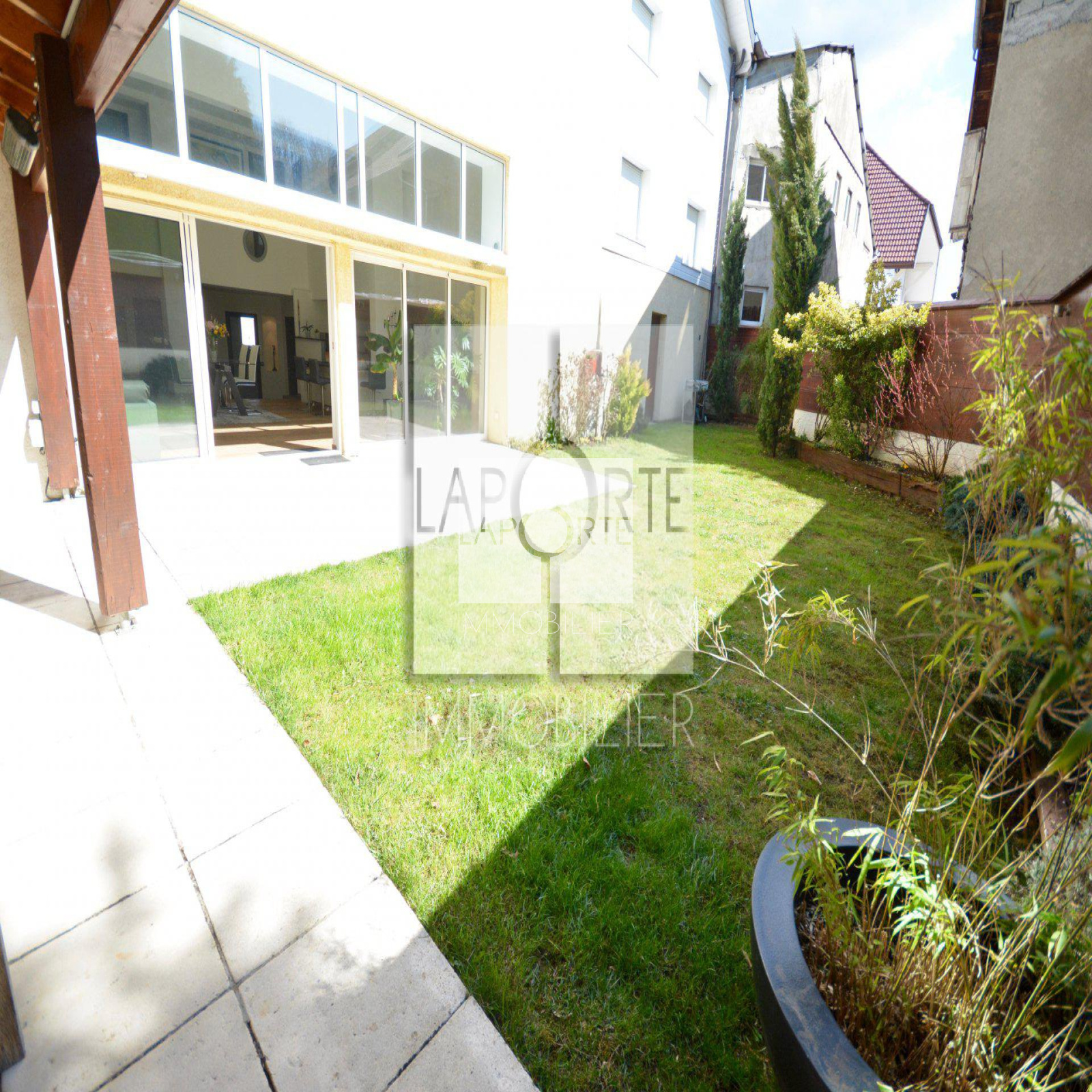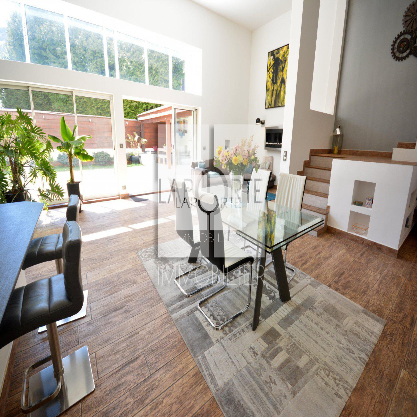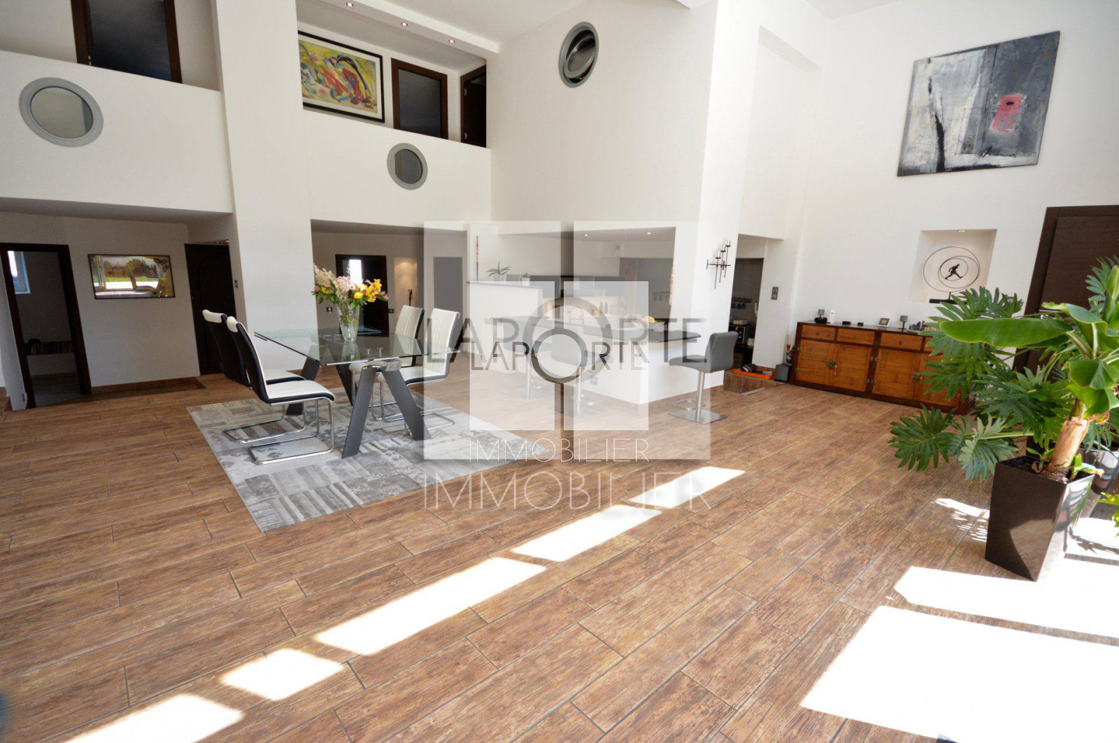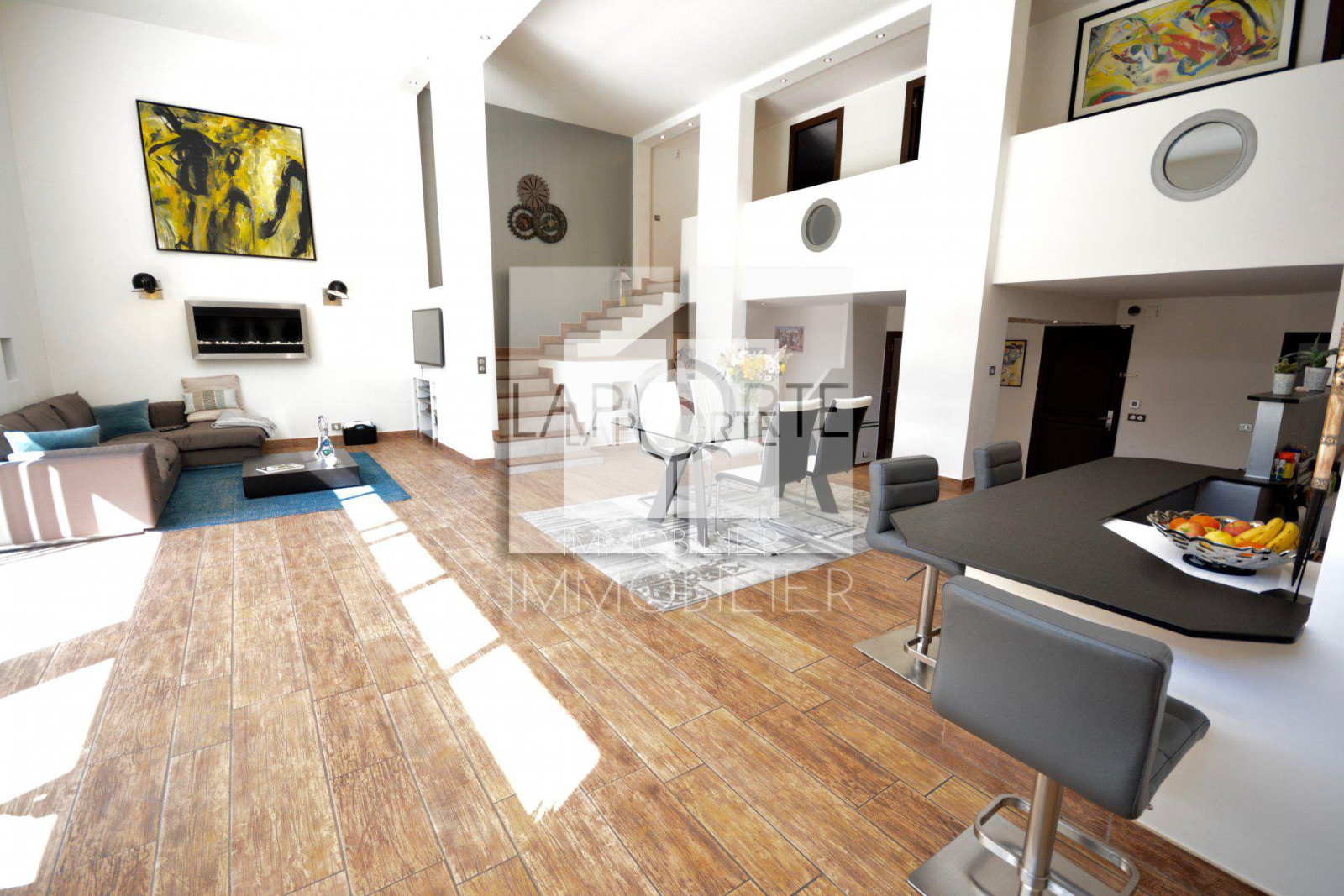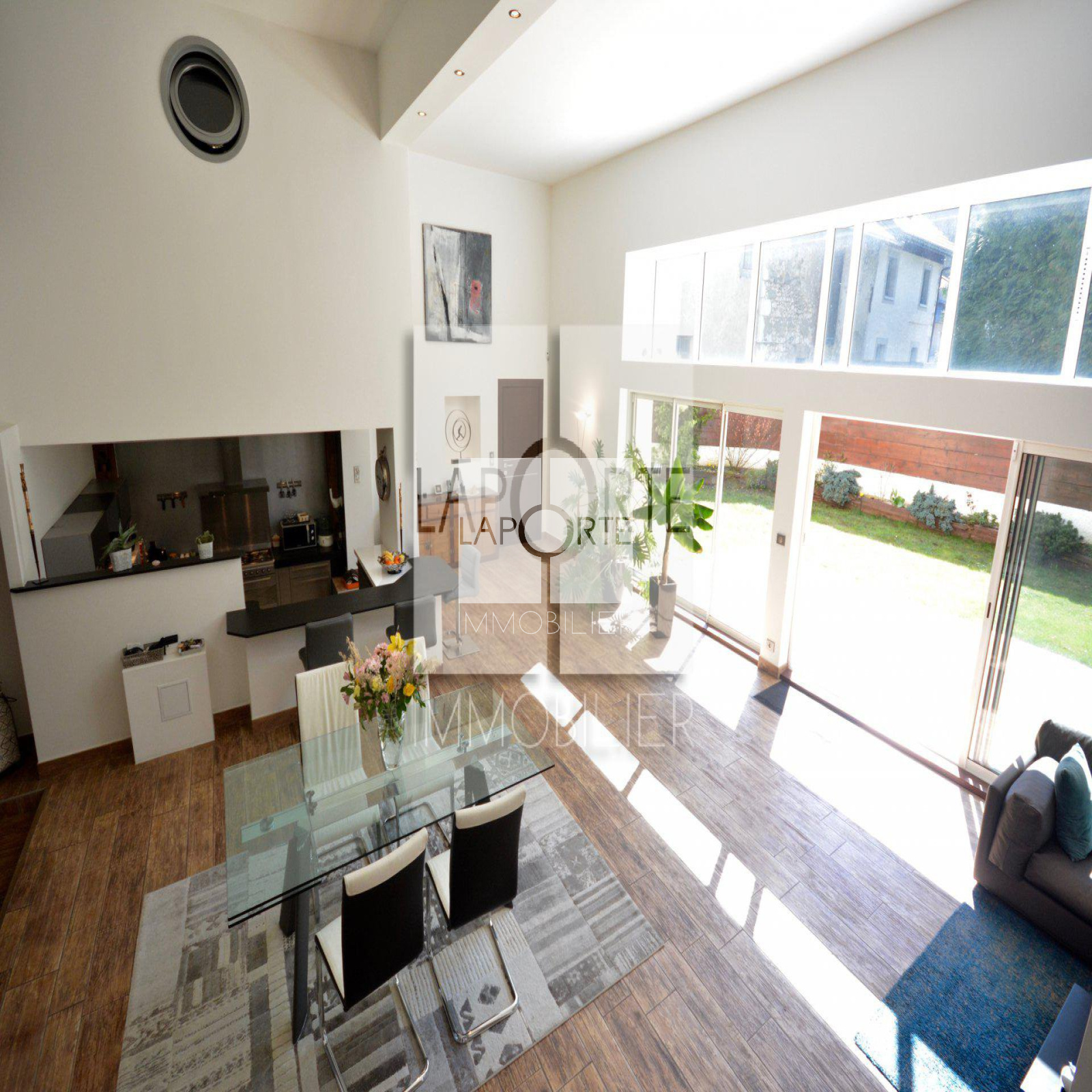 MI-MAISON / MI-APPARTEMENT T7 DUPLEX EN REZ DE JARDIN (233m2 de surface totale), un espace de vie de 64m2 avec des volumes exceptionnels (4,5m2 de hauteur sous plafond donnant sur un jardin . 4 chambres dont une au RDC. 2 salle de bains. Cuisine ouverte sur le séjour. Un grand garage (46m2) avec un accès direct. 2 places de parkings extérieures. Petite copropriété, pas de charges. Secteur calme. Accès facile autoroute (1500m). BIEN EXCEPTIONNEL