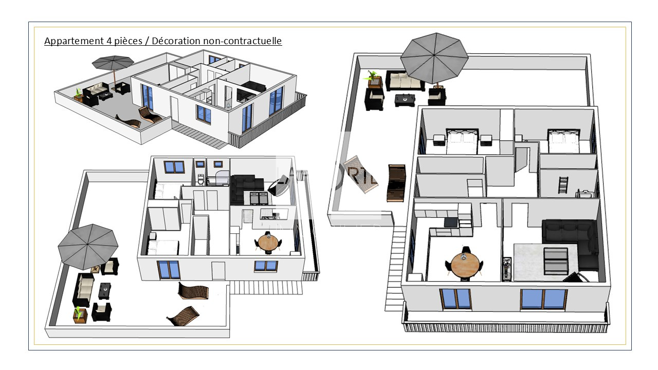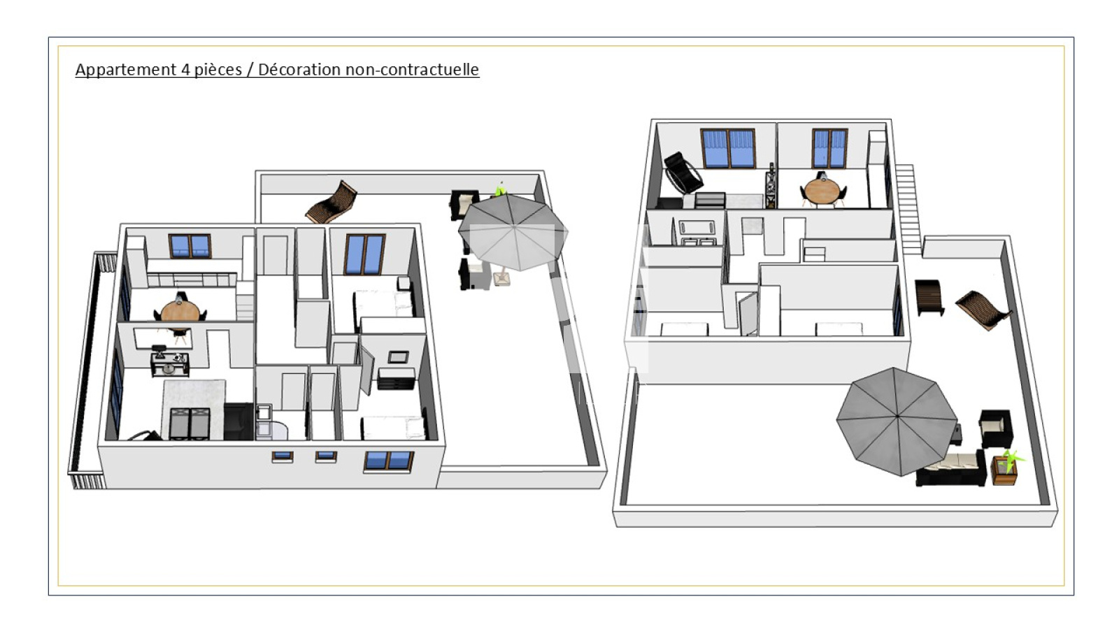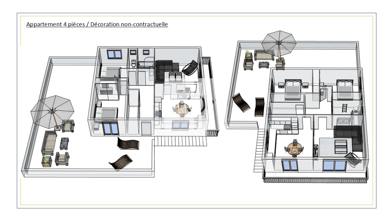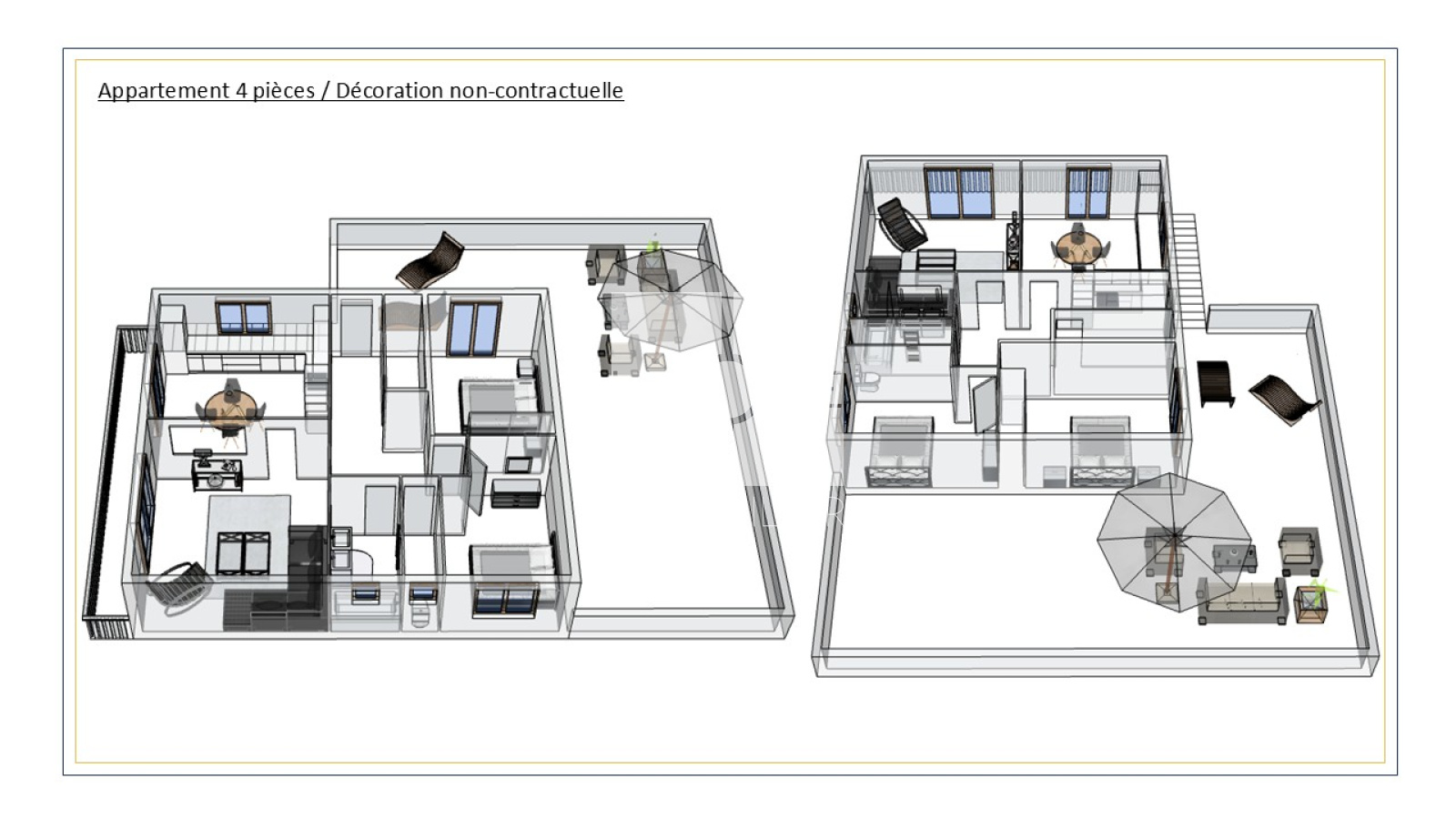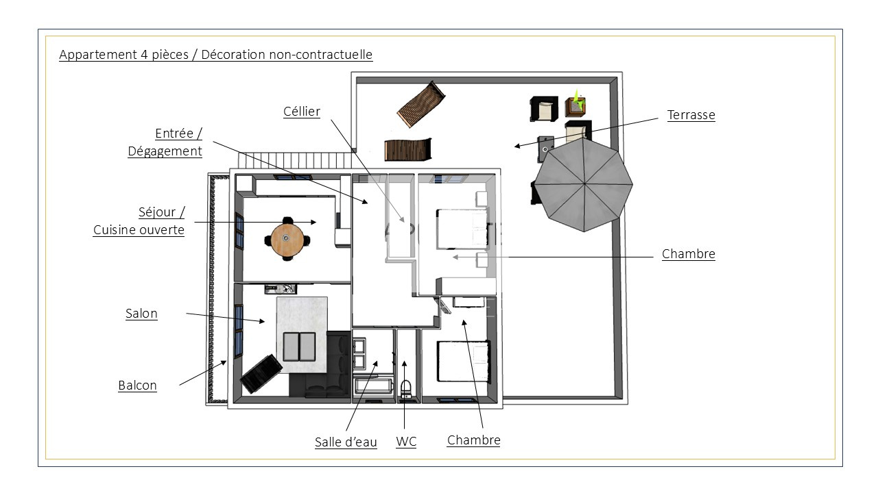 Il se compose d'un séjour / cuisine ouverte équipée, d'un salon attenant avec accès balcon, de deux chambres, d'une entrée avec cellier, d'une salle de bain, d'un wc séparé et d'une belle terrasse d'environ 80m2.