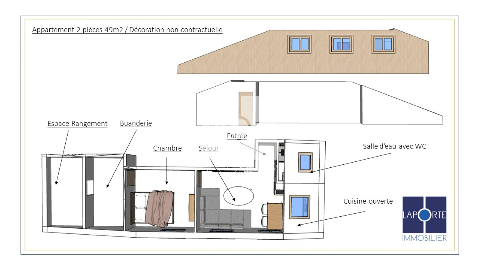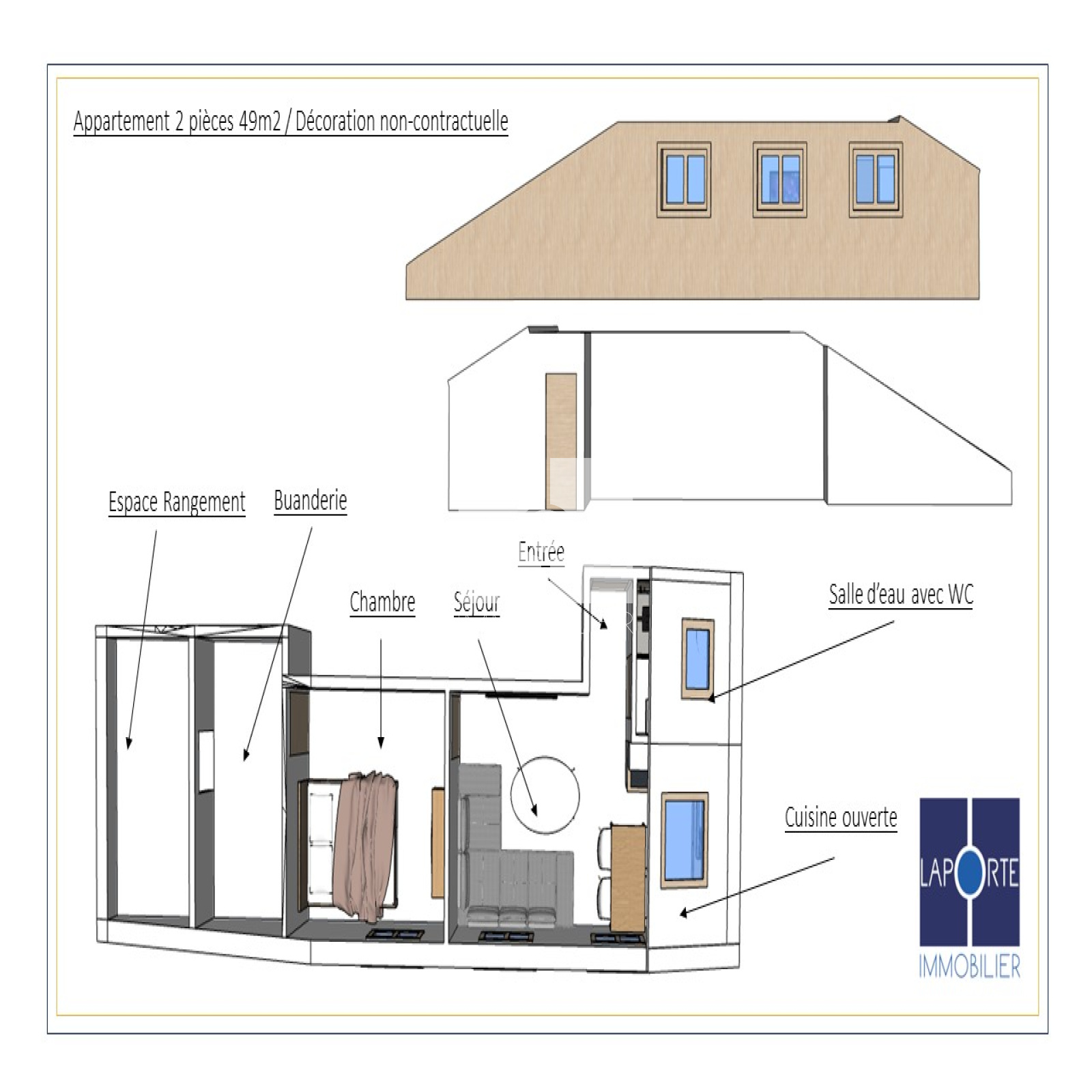 Le bien se compose d'un séjour cuisine ouverte équipée, d'une belle chambre avec dressing et rangement sous pente, une salle de bains avec WC, et un coin rangement sous pente.