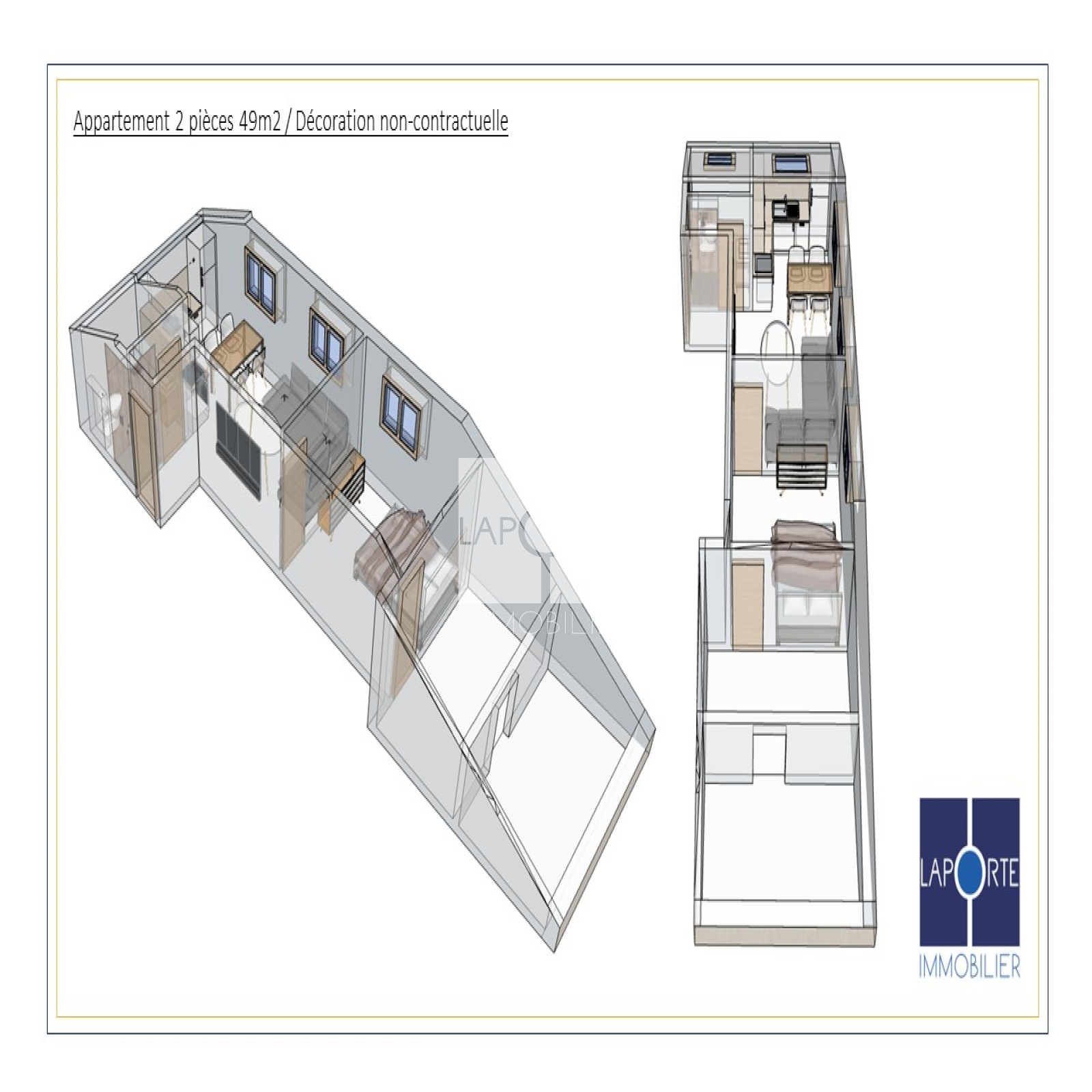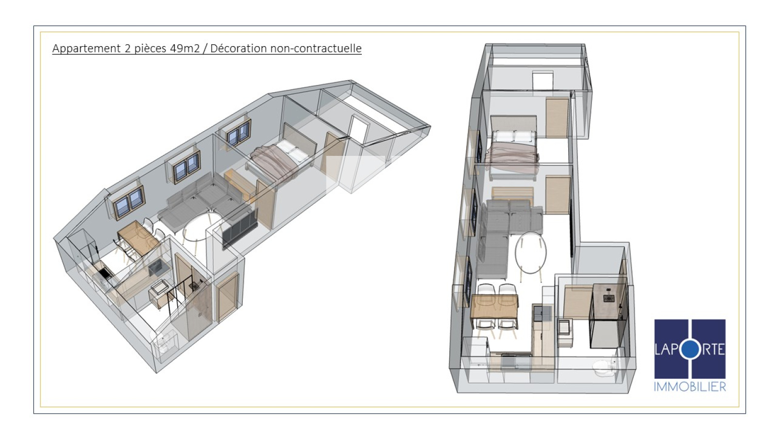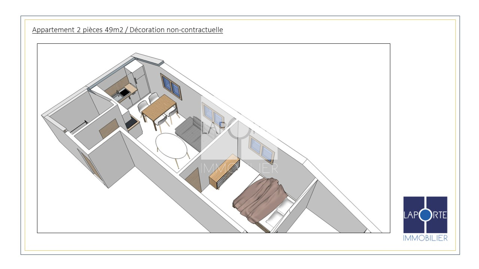 Appartement 2 pièces de 37m2 Carrez, 49m2 au sol.