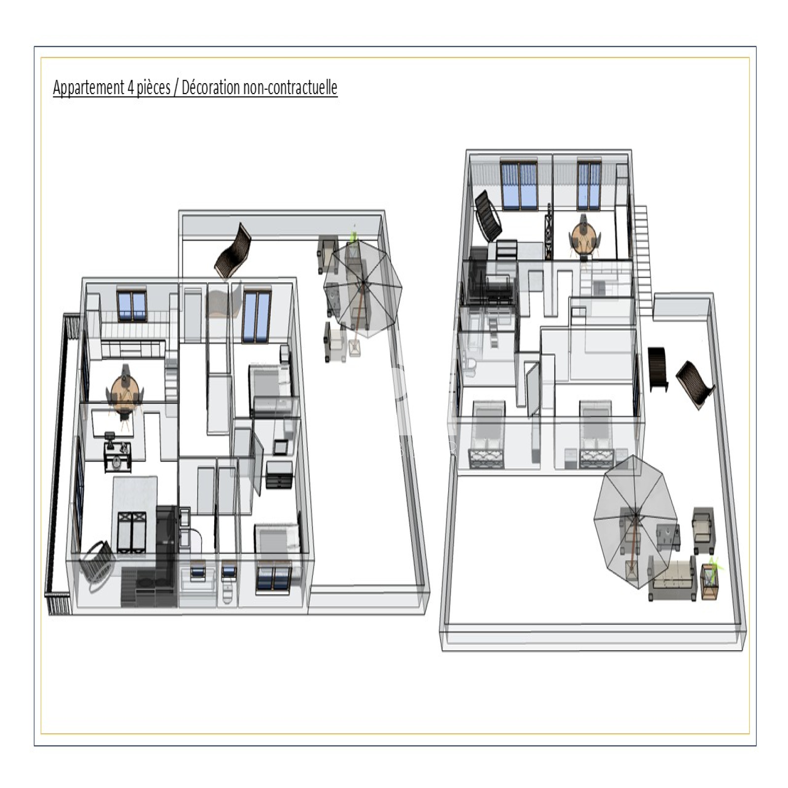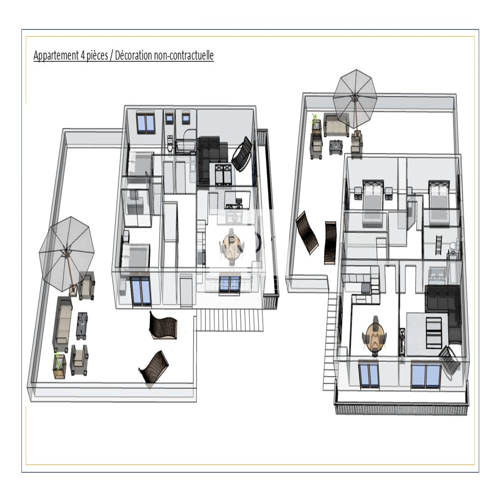 Il se compose d'un séjour / cuisine ouverte équipée, d'un salon attenant avec accès balcon, de deux chambres, d'une entrée avec cellier, d'une salle de bain, d'un wc séparé et d'une belle terrasse d'environ 80m2.