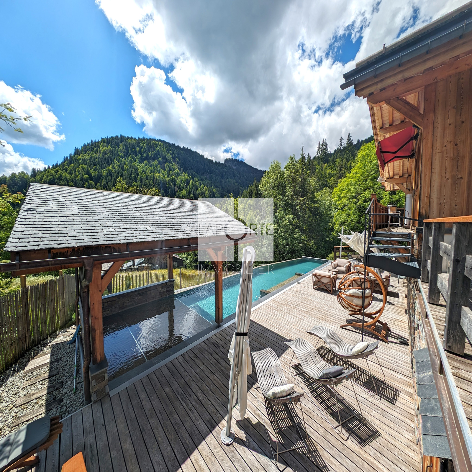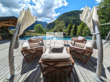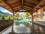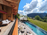 L'extérieur du chalet comprend trois terrasses, une piscine à débordement chauffée de 18 x 4 mètres, une cuisine d'été et un mazot indépendant de 20 m², un terrain de pétanque et un coin potager.