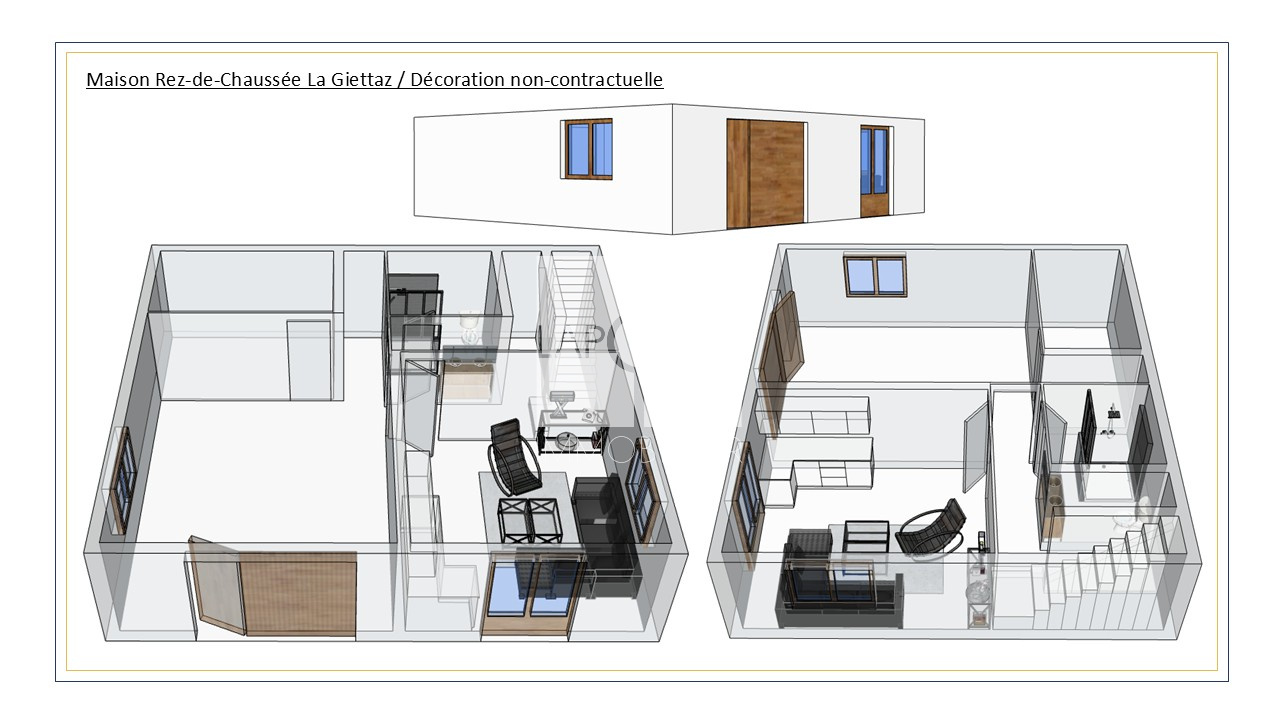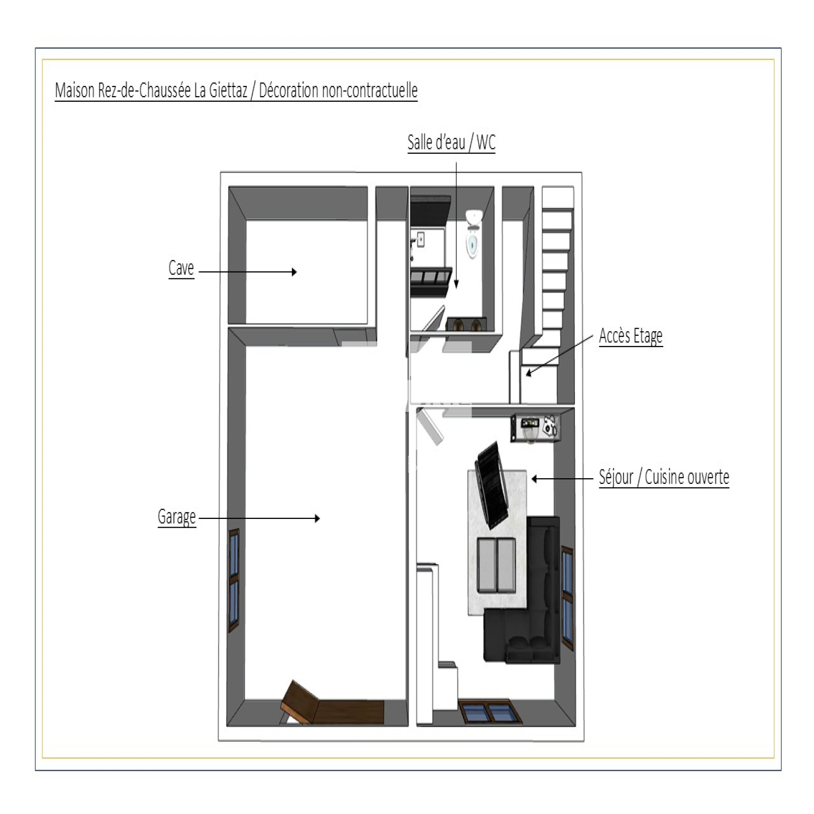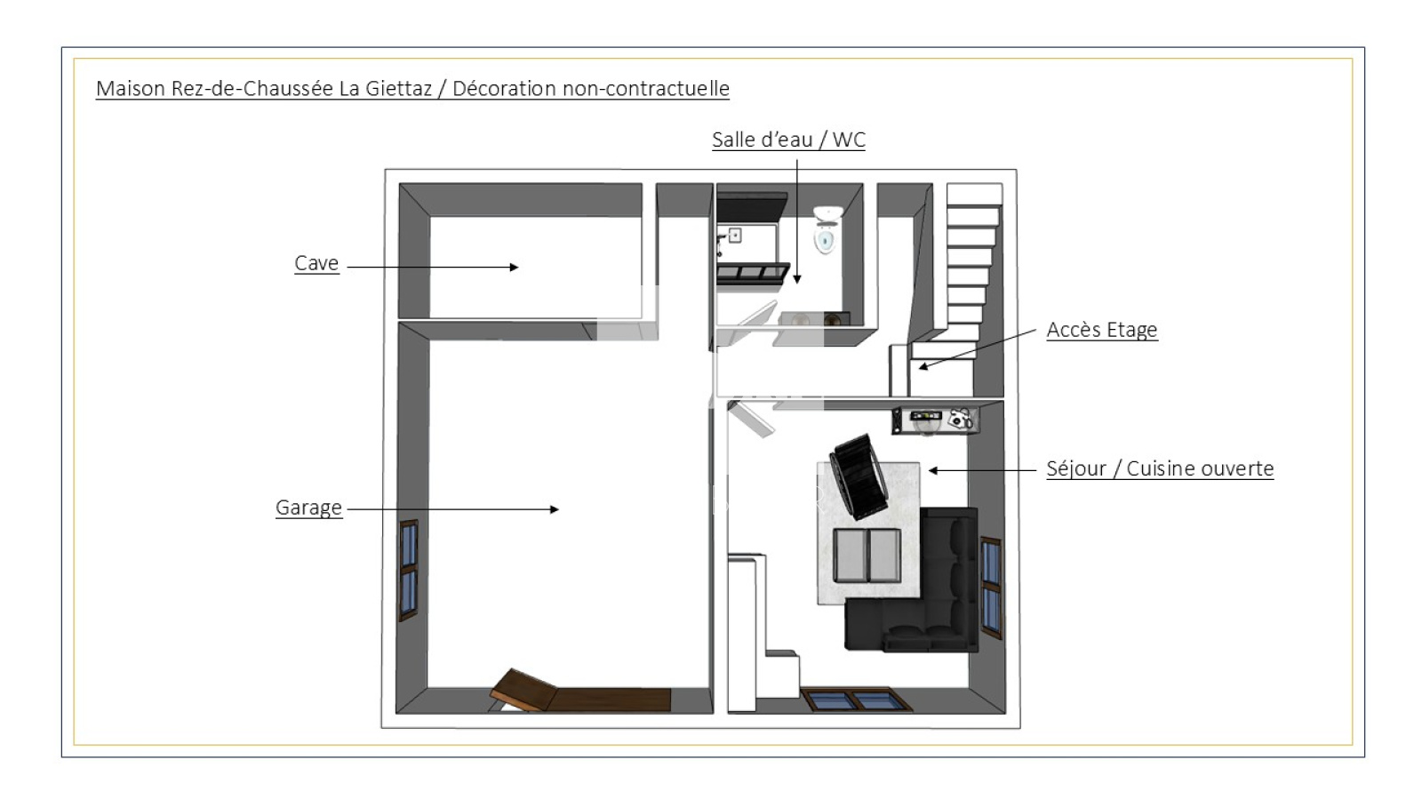 Le rez-de-chaussé se compose d'un garage, d'une cave, une salle d'eau avec WC, d'un dégagement et d'une chambre avec point d'eau.