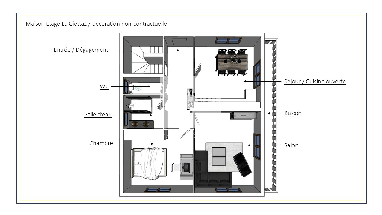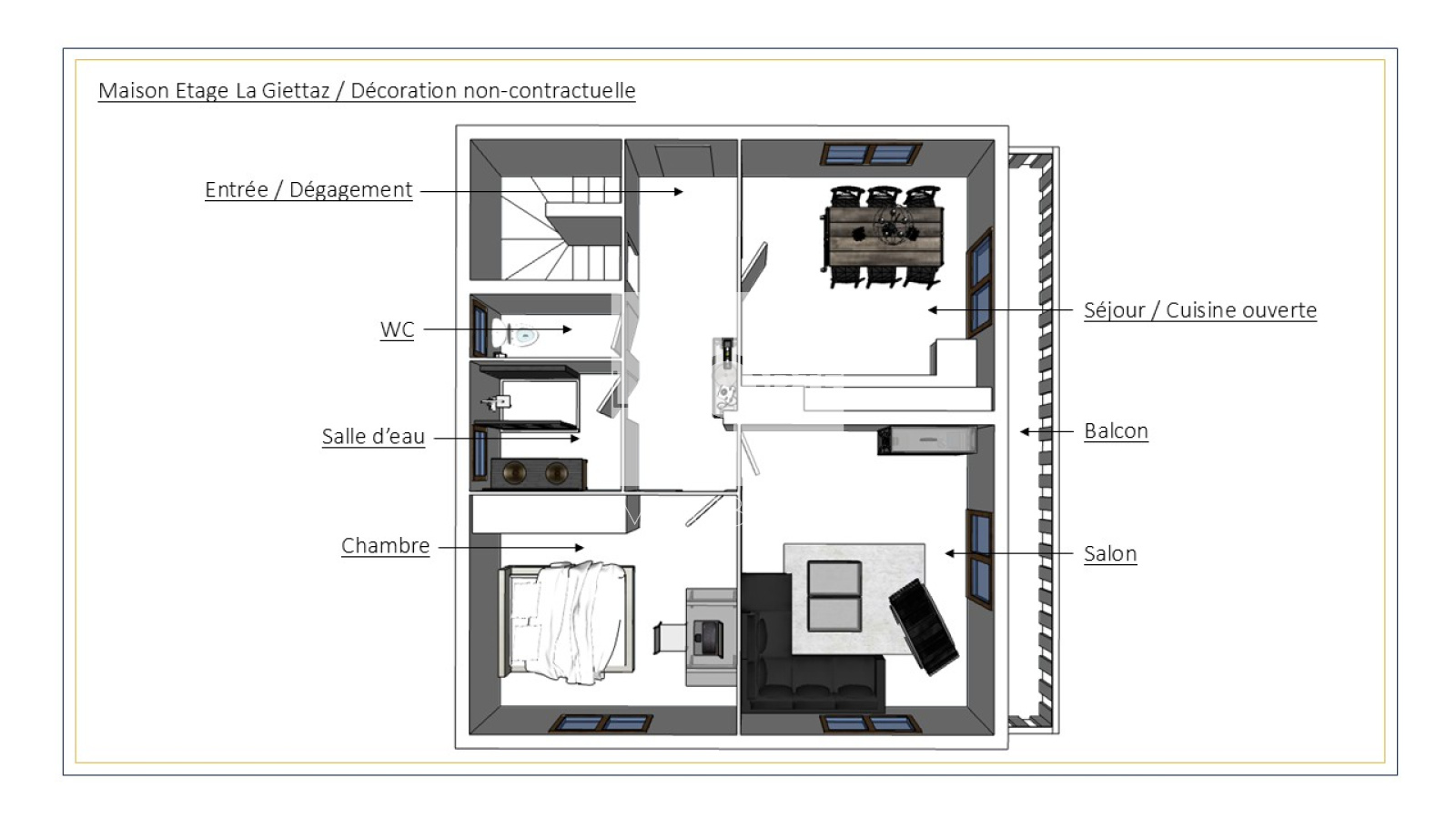 Orienté Sud-Ouest, il bénéficie d'une luminosité remarquable et d'une vue imprenable sur les massifs de l'Étale, de la chaîne des Aravis et des montagnes environnantes.