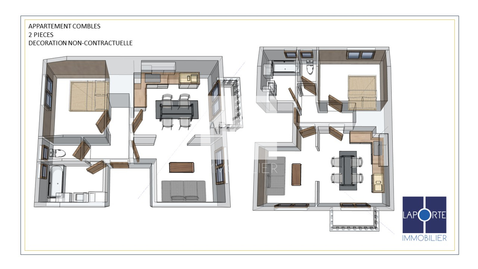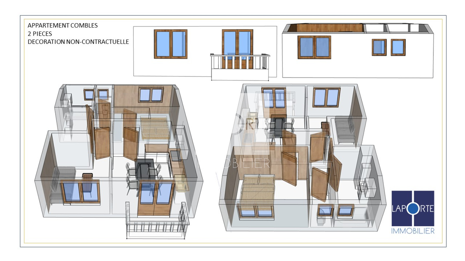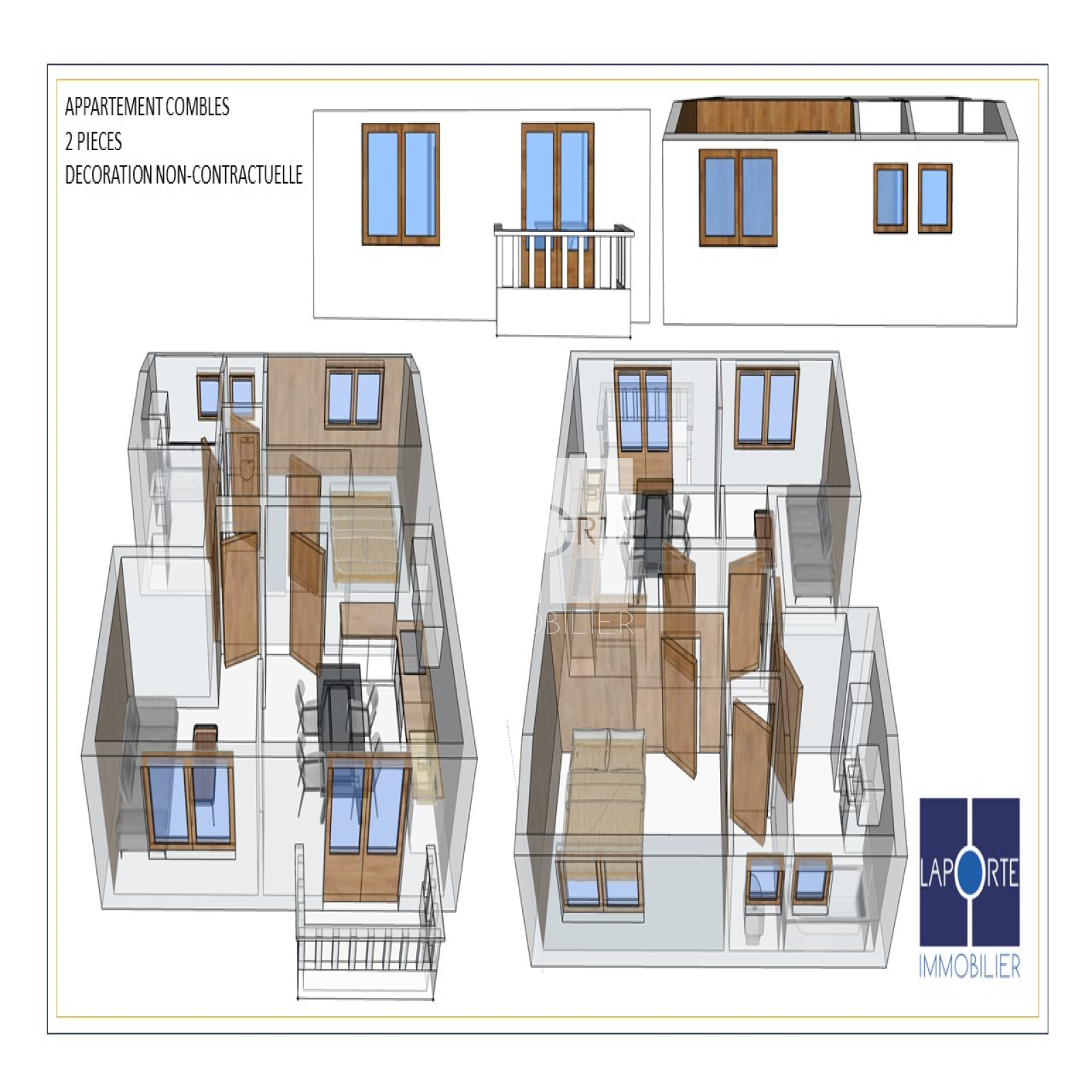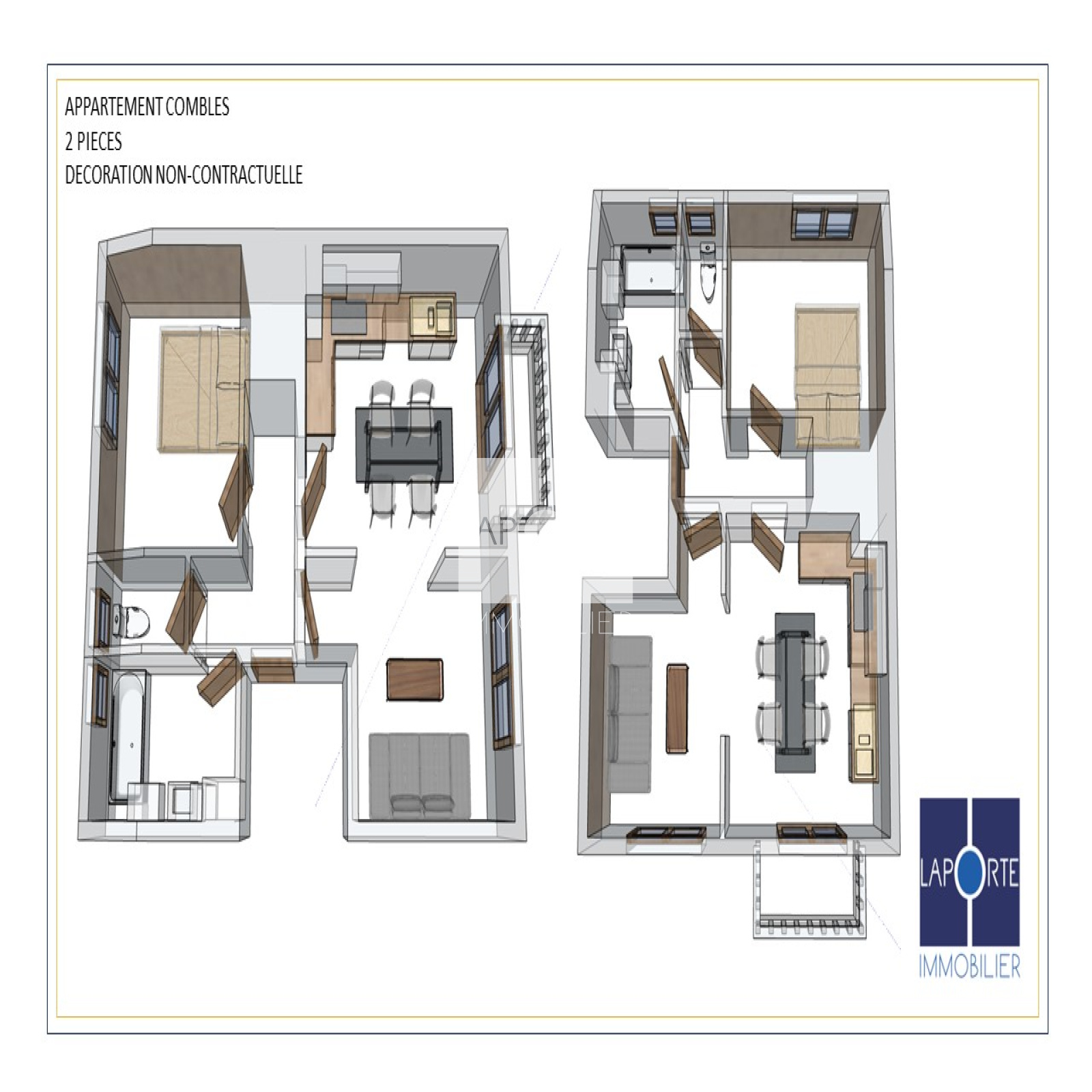 Un deuxième étage sous comble vous disposerez d'un 2 pièces de 50m2 Carrez, comprenant un séjour cuisine ouverte avec accès à un balcon, une chambre, une salle de bain et un wc séparé.